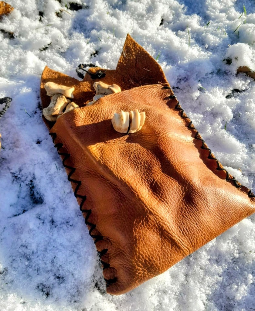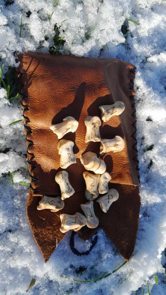 Individual Rune sets, engraved on deer bones. Complete with storage bag hand made from recycled leather.